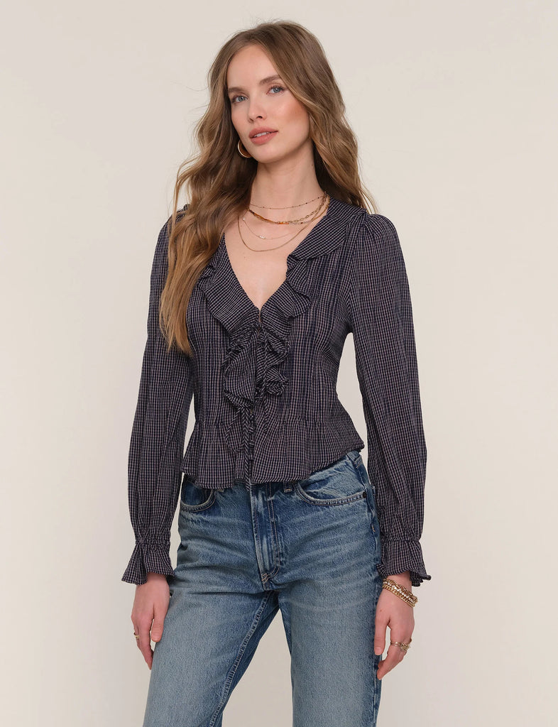 The Suri Top is a super pretty, femme blouse. It features a ruffle around the neck, delicate pintucks at the front body and an elastic sleeve cuff. We love it simply paired with denim.